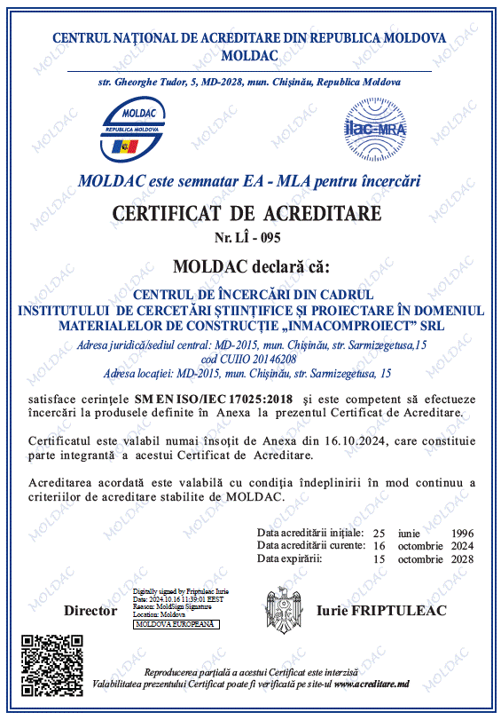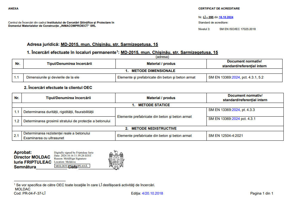 Лаборатория испытаний железобетонных конструкций и разработки новых технологий является единственной в Молдове выполняющей испытания железобетонных конструкций нагружением в соответствии с требованиями EN на заводах-изготовителях, а также испытания неразрушающими методами контроля смонтированных конструкций непосредственно на строительной площадке.